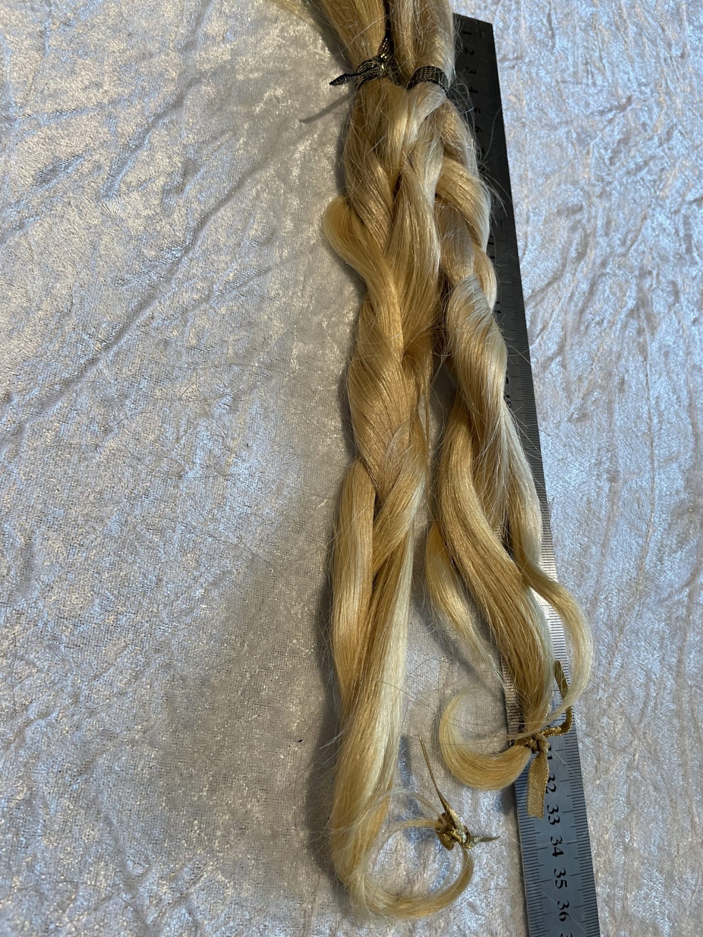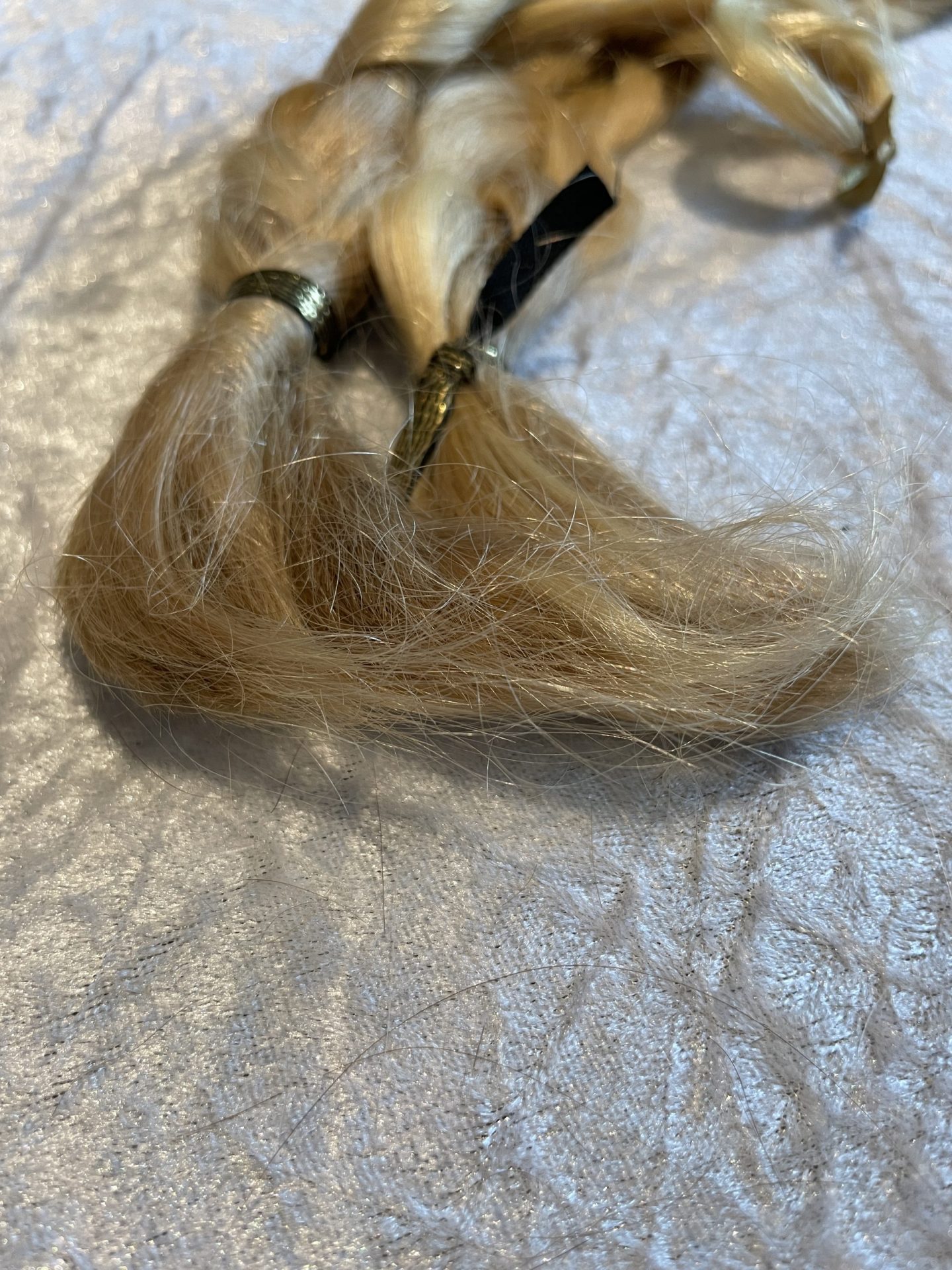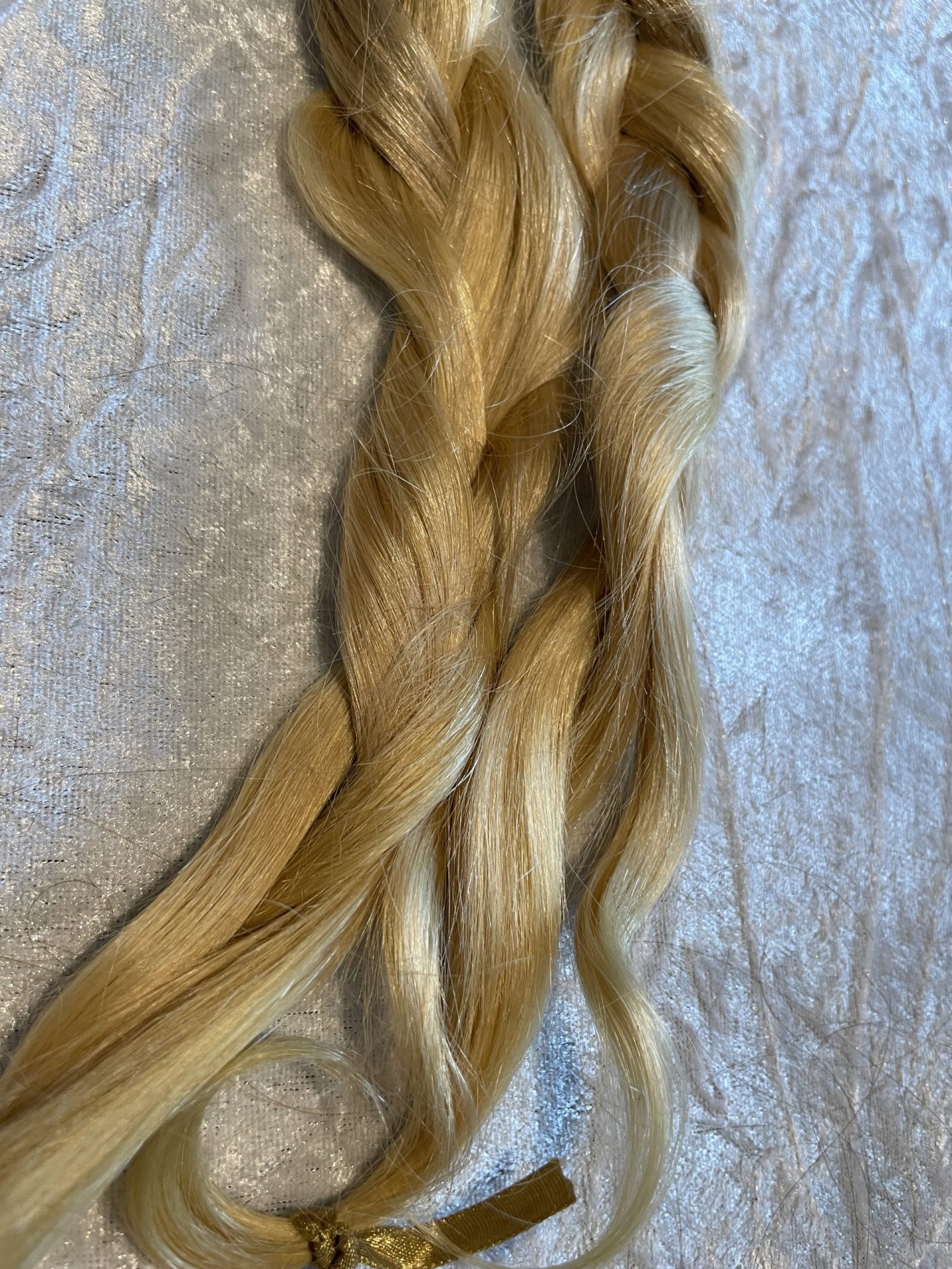 Bei Lieferungen in Nicht-EU-Länder können zusätzliche Zölle, Steuern und Gebühren anfallen.Kleiner blonder Zopf, fein, glatt mit leichtem Schwung, glänzend, leichte Struktur, Haar ist etwas trocken, braucht eine Kur. Blondiert, war vorher Mittelblond, leichte Strähnen. Länge 30 cm in Spitzen bis etwa 36 cm. Hat Unterlängen. Gemessen in geflochtenem Zustand.