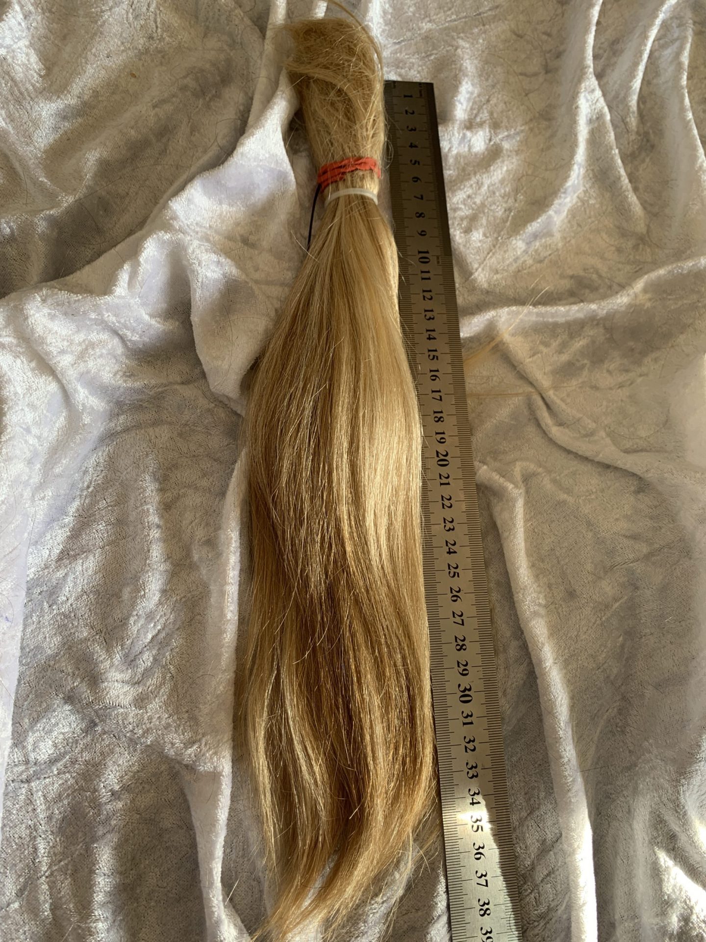 Bei Lieferungen in Nicht-EU-Länder können zusätzliche Zölle, Steuern und Gebühren anfallen.Schöner gold-blonder Zopf, gute Struktur, schöner Schwung, griffig. Länge 35 cm, in Spitzen über 38. Hat einige Unterlängen.