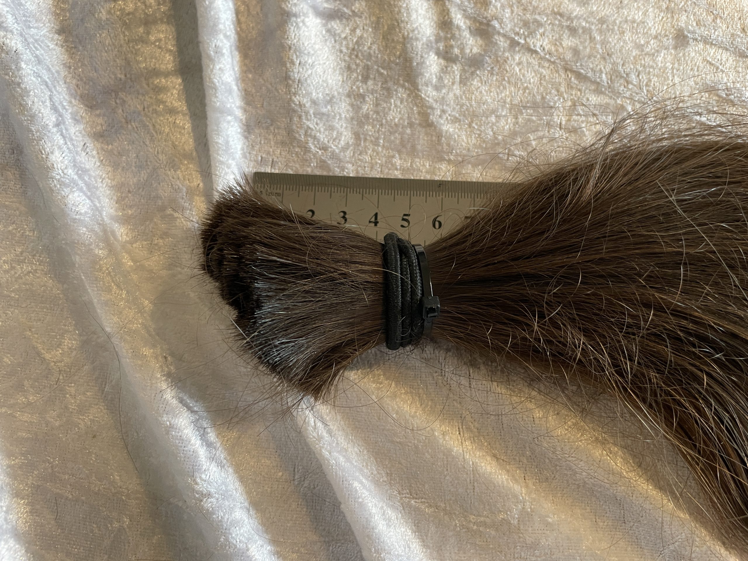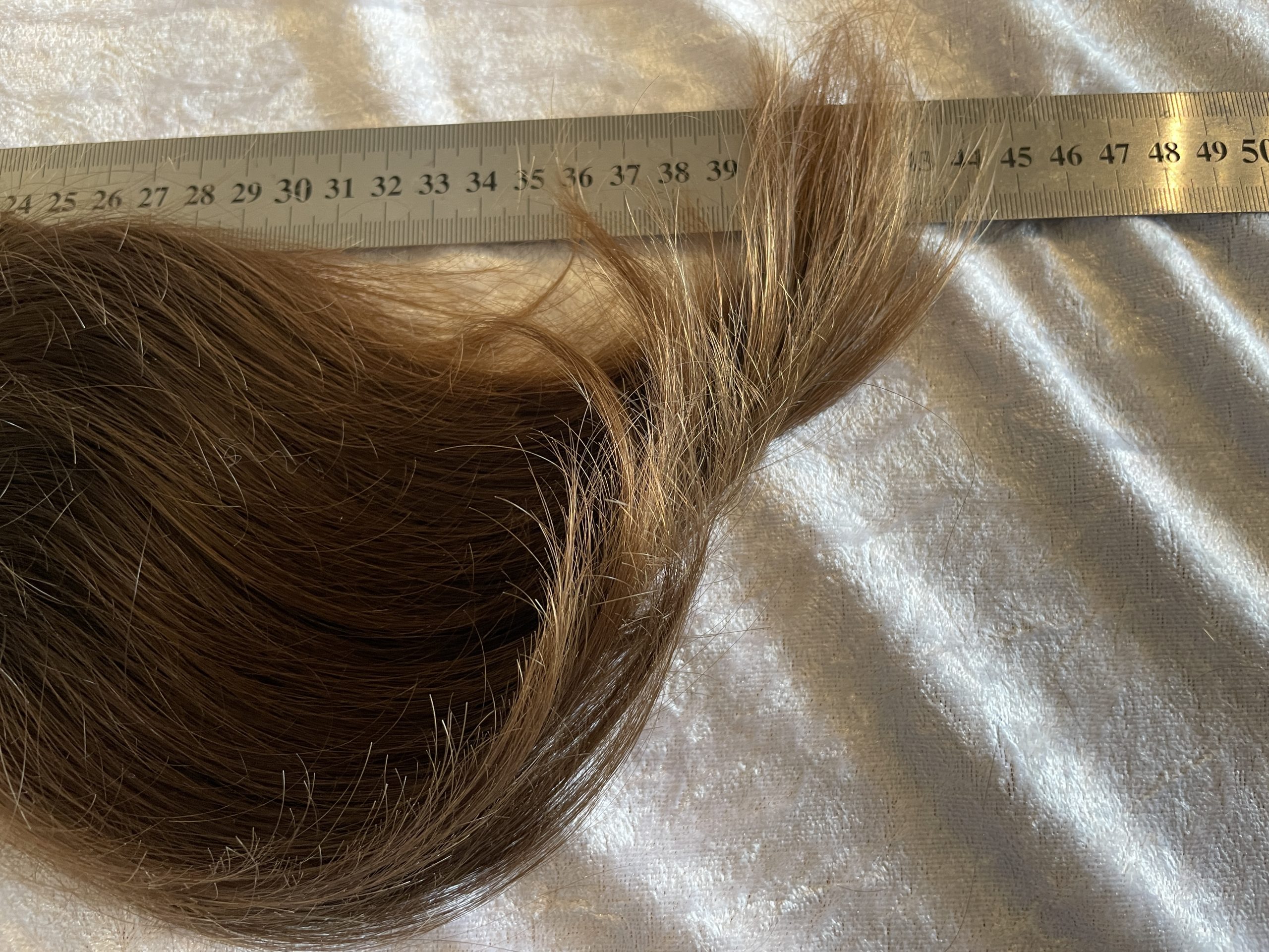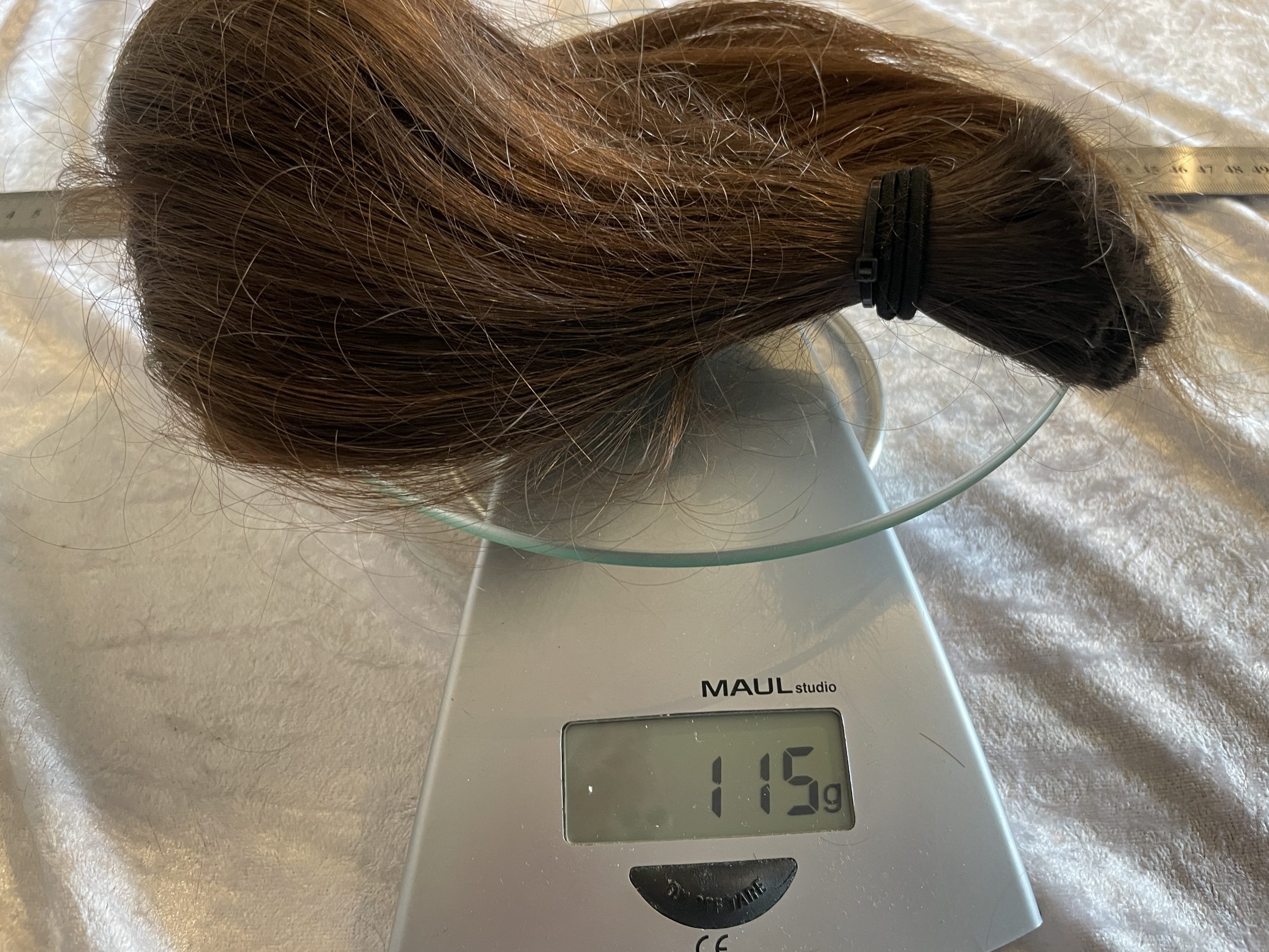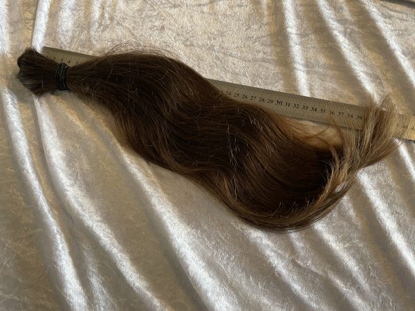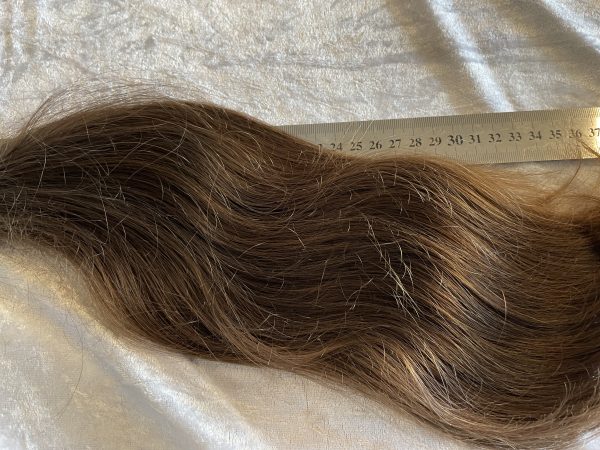 Bei Lieferungen in Nicht-EU-Länder können zusätzliche Zölle, Steuern und Gebühren anfallen.Ordentlich voller, brauner/kastanienbrauner Zopf, gepflegt, leichte Struktur, mässig kräftig. Fällt sehr schön, 40 cm, in Spitzen bis knapp 50 cm, hat deutliche Unterlängen. Das Haar stammt von einem jungen Mann (17 Jahre)