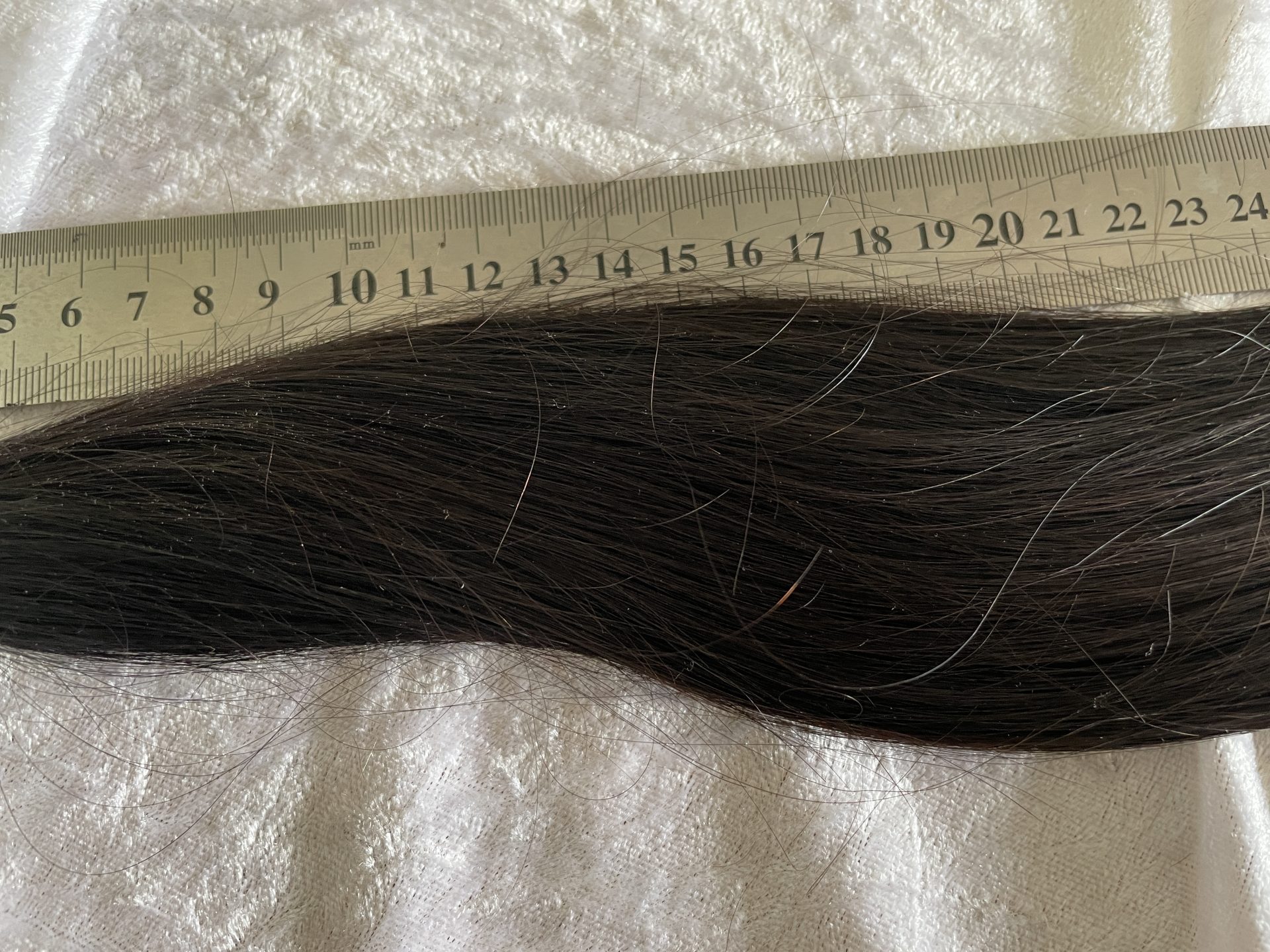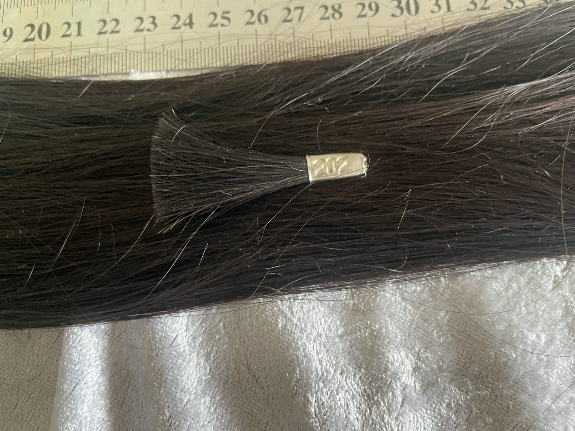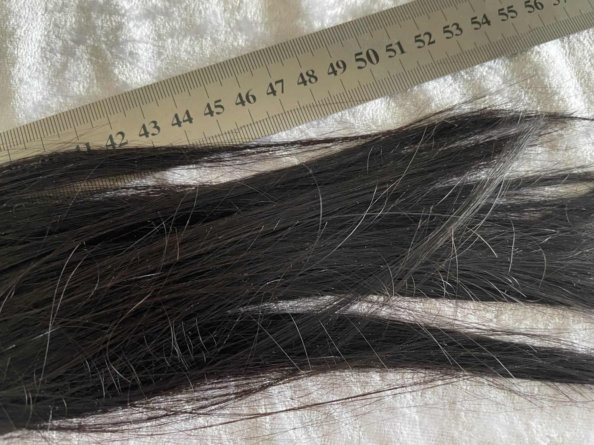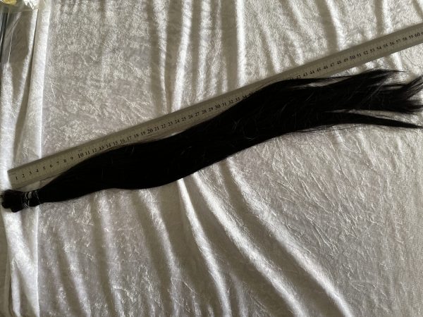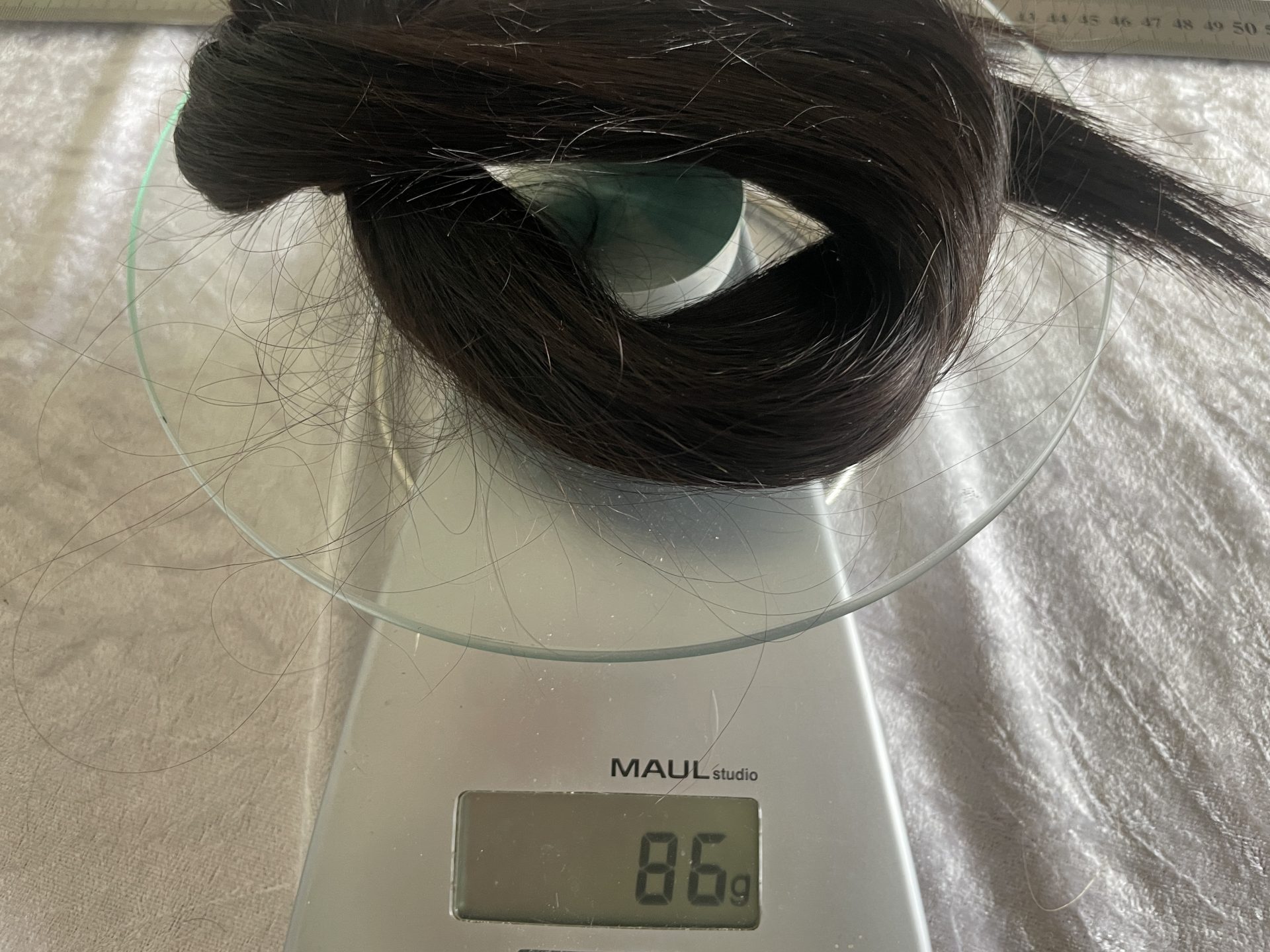Bei Lieferungen in Nicht-EU-Länder können zusätzliche Zölle, Steuern und Gebühren anfallen.Sehr schöner, dunkelbrauner, fast schwarzer Zopf, kaum Struktur, sehr feines, glattes Haar, gut gepflegt. Zopf hat einige Unterlängen, 55 cm, in Spitzen länger.